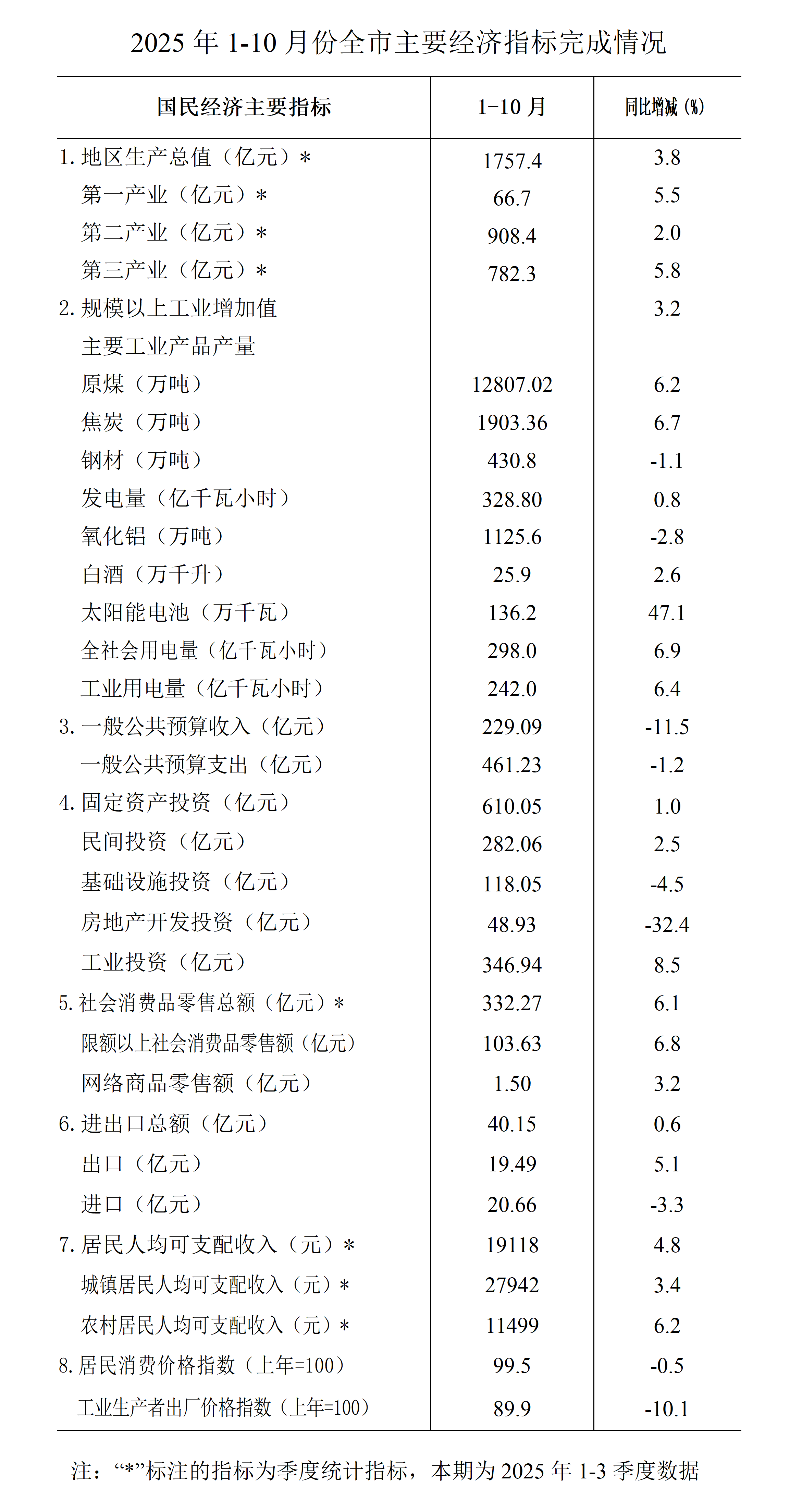 2025年1-10月份全市主要经济指标完成情况