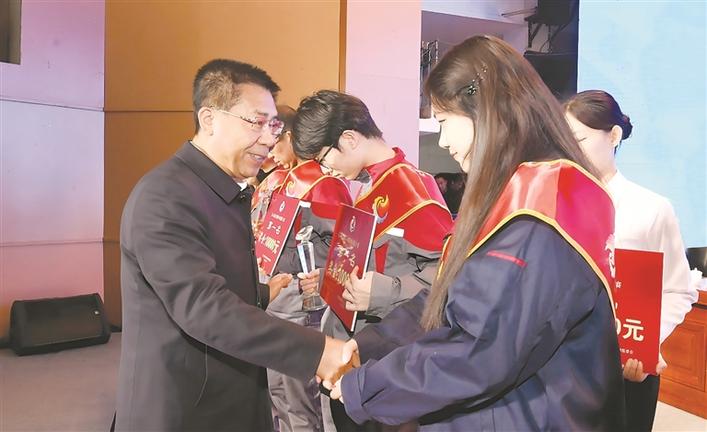 图为市委书记孙大军为“吕梁技术状元”称号获得者颁奖。 记者 王益炜 摄