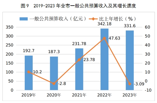 全年全市一般公共预算支出625.55亿元,比上年增长13.27%。其中,一般公共服务支出68.35亿元,增长9.52%;教育支出95.27亿元,增长8.11%;卫生健康支出55.45亿元,增长9.37%;社会保障和就业支出71.51亿元,增长13.93%;住房保障支出24.89亿元,增长14.41%;节能环保支出31.79亿元,增长1.74%;城乡社区等民生支出83.93亿元,增长22.51%。