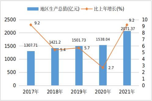 初步核算,全年实现地区生产总值2071.37亿元,按不变价格计算,比上年增长9.2%。其中,第一产业增加值104.75亿元,增长7.5%,占地区生产总值的比重为5.06%;第二产业增加值1351.4亿元,增长10.1%,占地区生产总值的比重为65.24%;第三产业增加值615.21亿元,增长8.2%,占地区生产总值的比重为29.7%。