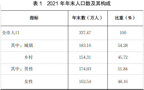 2021年末全市常住人口337.47万人,比上年末减少1.98万人。其中,城镇常住人口183.16万人,占常住人口比重为54.28%,比上年末提高0.97个百分点。全年全市出生人口2.52万人,出生率为7.44‰;死亡人口2.31万人,死亡率为6.82‰;自然增长率为0.62‰。