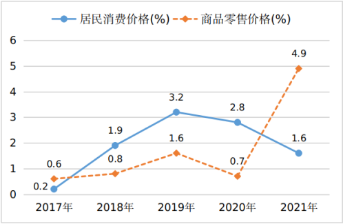 图2 2017-2021年全市居民消费价格及商品零售价格涨幅