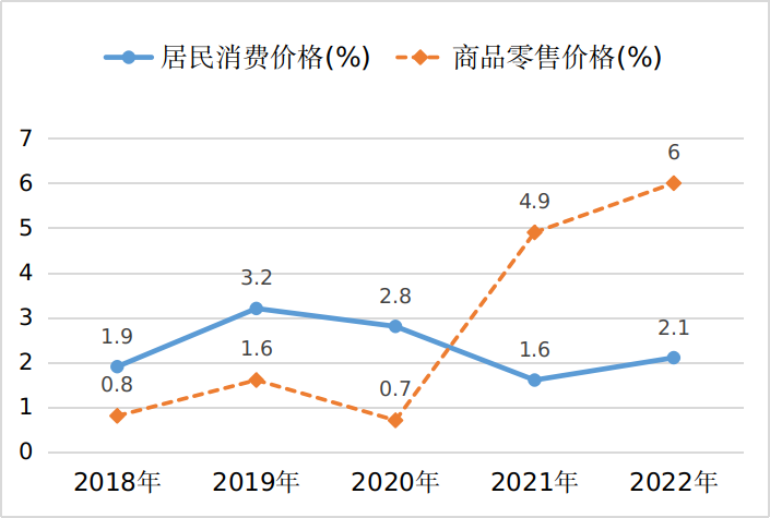 图2 2018-2022年全市居民消费价格及商品零售价格涨幅
