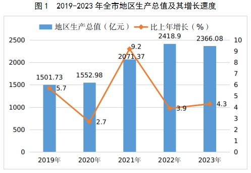 初步核算,全年全市实现地区生产总值2366.08亿元,按不变价格计算,比上年增长4.3%。其中,第一产业增加值109.73亿元,增长4.5%,占地区生产总值的比重为4.64%;第二产业增加值1593.66亿元,增长3.3%,占地区生产总值的比重为67.35%;第三产业增加值662.69亿元,增长6%,占地区生产总值的比重为28.01%。全年人均地区生产总值70449元,增长4.7%。