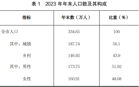 2023年末全市常住人口334.65万人,比上年末减少2.4万人。其中,城镇常住人口187.74万人,占常住人口比重为56.1%,比上年末提高1.2个百分点。全年全市出生人口2.22万人,出生率为6.6‰;死亡人口2.54万人,死亡率为7.55‰;自然增长率为-0.94‰。