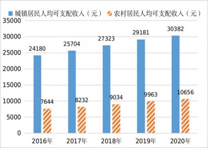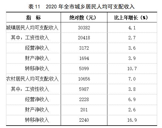 全年全市城镇居民人均可支配收入30382元,增长4.1%,城镇居民人均消费支出17054元,下降3.4%;农村居民人均可支配收入10656元,增长7%,农村居民人均消费支出8006元,增长6%。