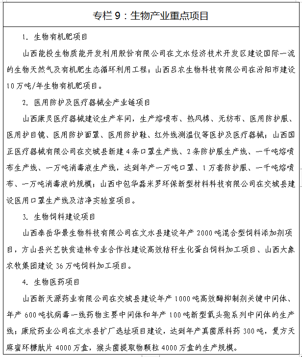 以交城、文水、离石等为重点,推进生物医药及大健康产业;以方山、临县等为重点,发展中药材产业;以文水诚信种业为重点,发展生物育种;以大象禽业象丰饲料、交城华鑫肥业等为重点发展生物饲料、生物肥料等制造。