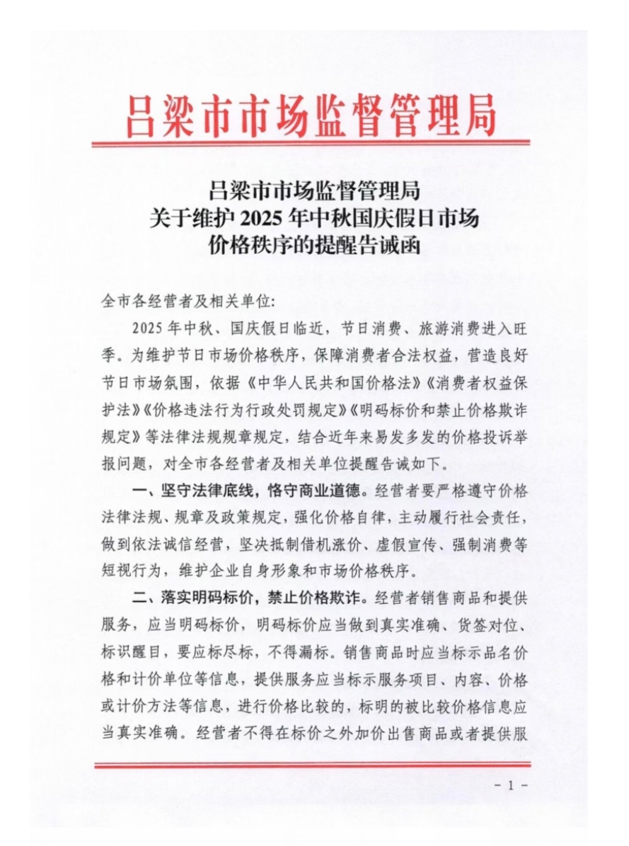 吕梁市市场监督管理局关于维护2025年中秋国庆假日市场价格秩序的提醒告诫函